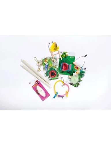 Cups, perches, accessories and toys are included